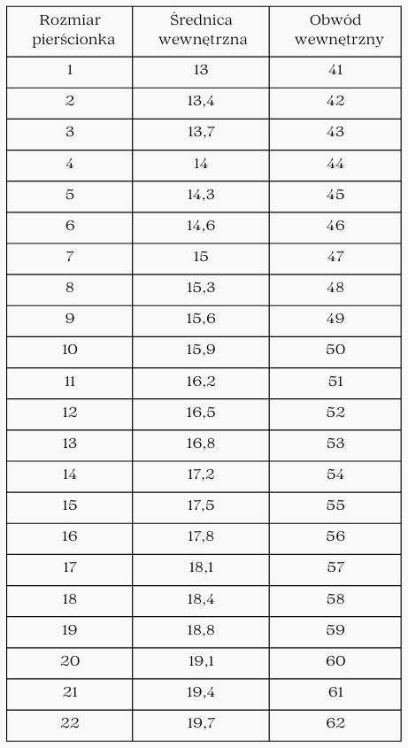 Podczas pomiaru poproś o podanie wewnętrznego obwodu pierścionka (w mm), a nie wyłącznie numeru rozmiaru. Poszczególni jubilerzy mogą stosować różne systemy rozmiarowe, dlatego najbardziej uniwersalną i miarodajną wartością jest obwód wewnętrzny wyrażony w milimetrach. Na jego podstawie bez problemu dopasujesz właściwy rozmiar z naszej tabeli.