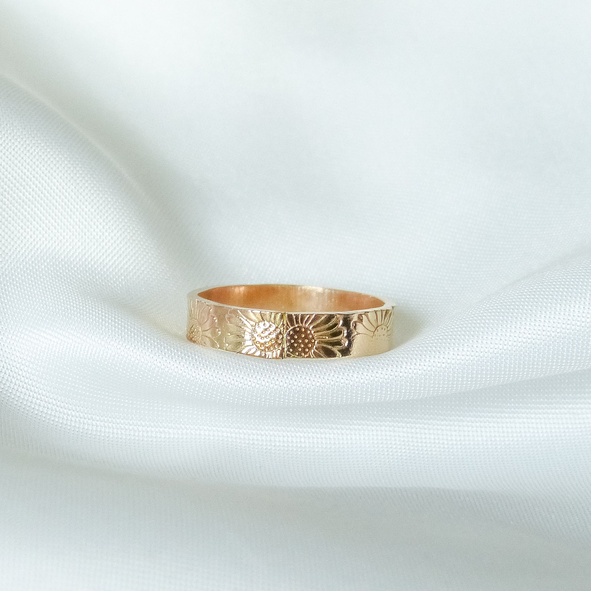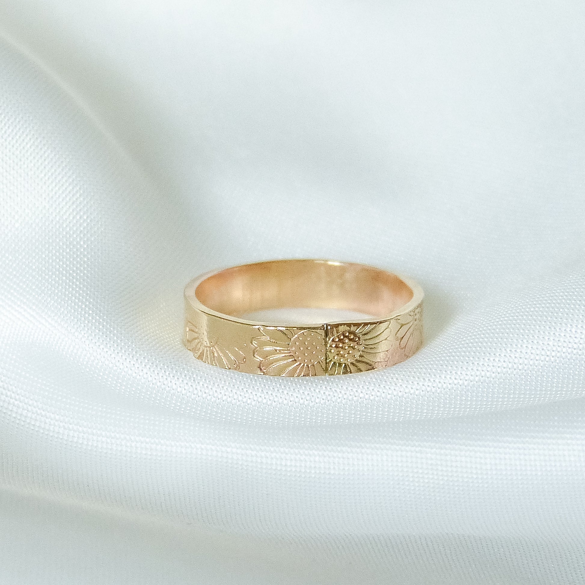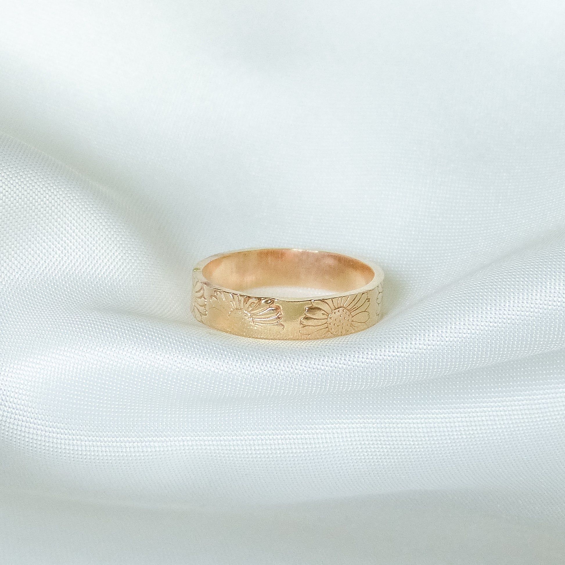 Delikatnie tłoczone kwiaty urodzinowe subtelnie zdobią całą powierzchnię eleganckiej obrączki, nadając jej wyjątkowego charakteru. To nie tylko piękna biżuteria, ale także symbol bliskich osób, o których ten pierścionek może Ci przypominać codziennie. Może również symbolizować miesiąc Twoich urodzin lub osoby obdarowanej, dla której pierścionek ten będzie wyjątkowym prezentem personalizowanym.