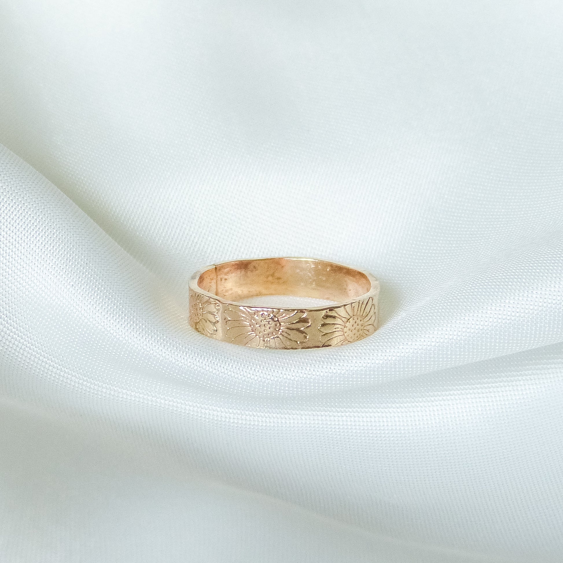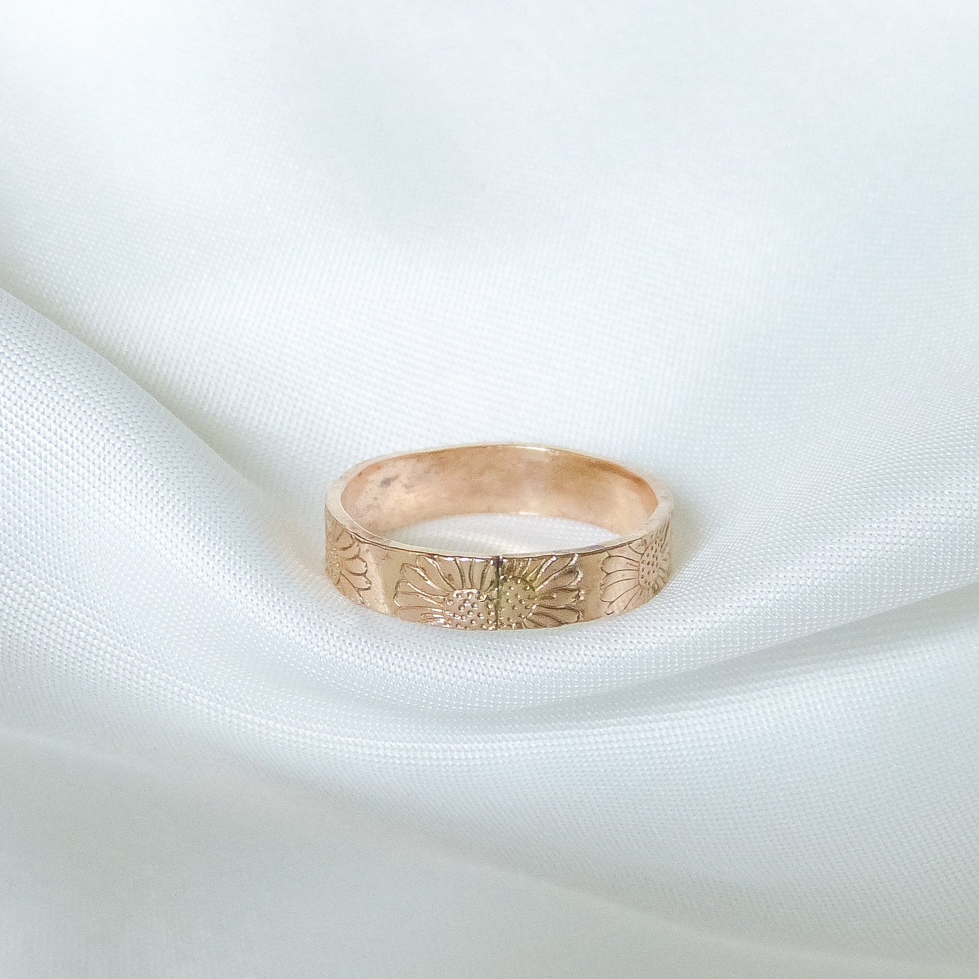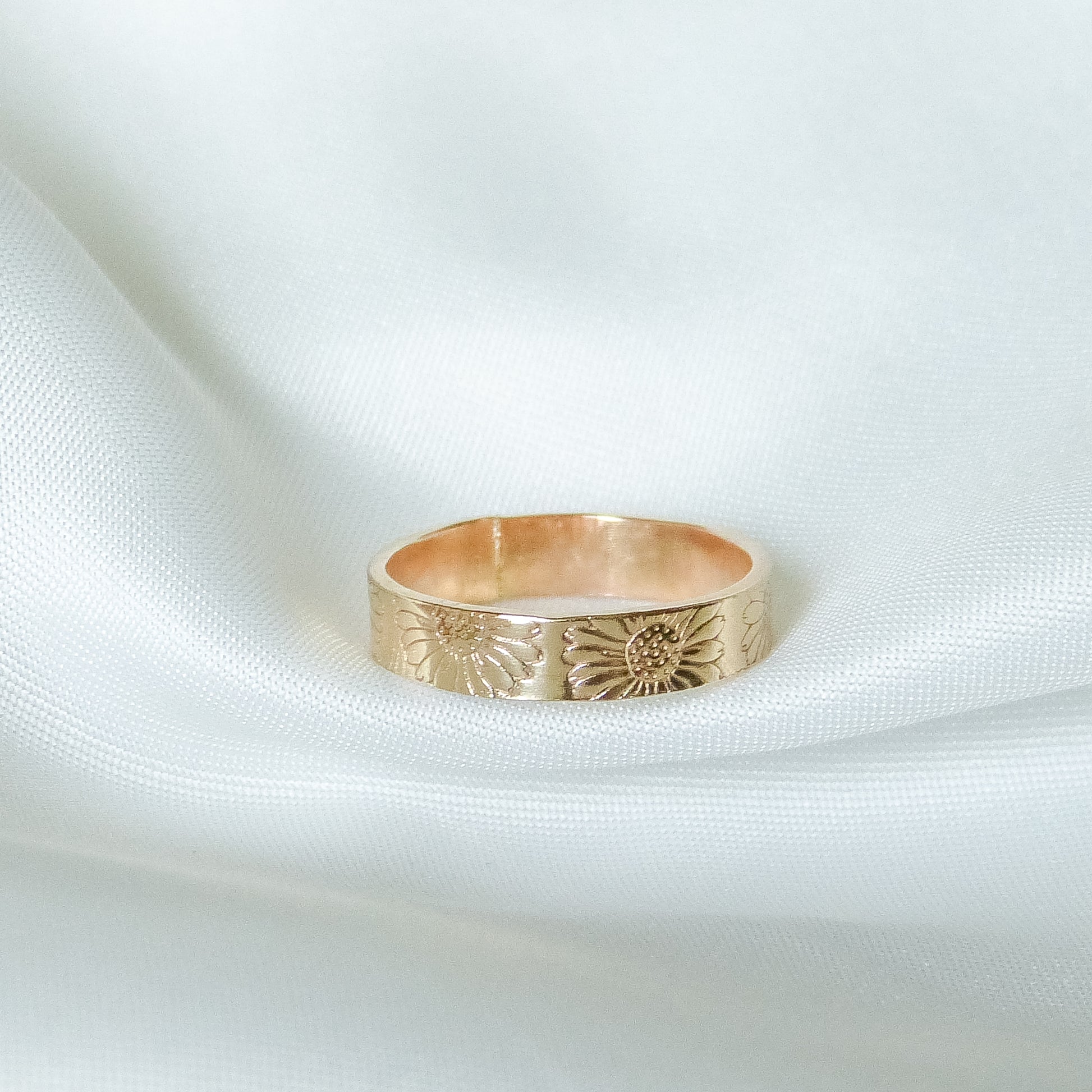Delikatnie tłoczone kwiaty urodzinowe subtelnie zdobią całą powierzchnię eleganckiej obrączki, nadając jej wyjątkowego charakteru. To nie tylko piękna biżuteria, ale także symbol bliskich osób, o których ten pierścionek może Ci przypominać codziennie. Może również symbolizować miesiąc Twoich urodzin lub osoby obdarowanej, dla której pierścionek ten będzie wyjątkowym prezentem personalizowanym.