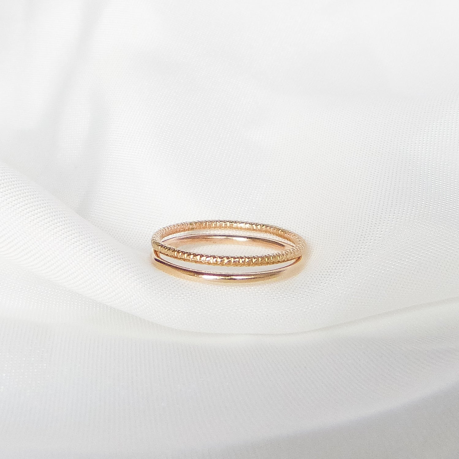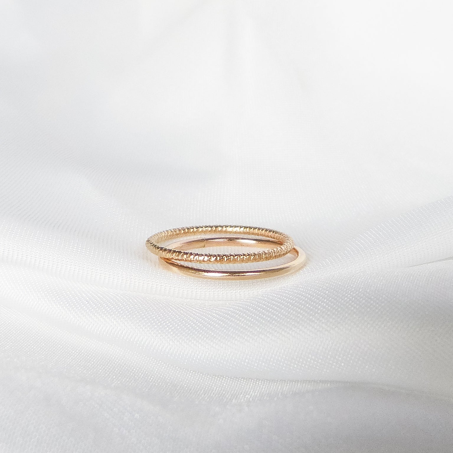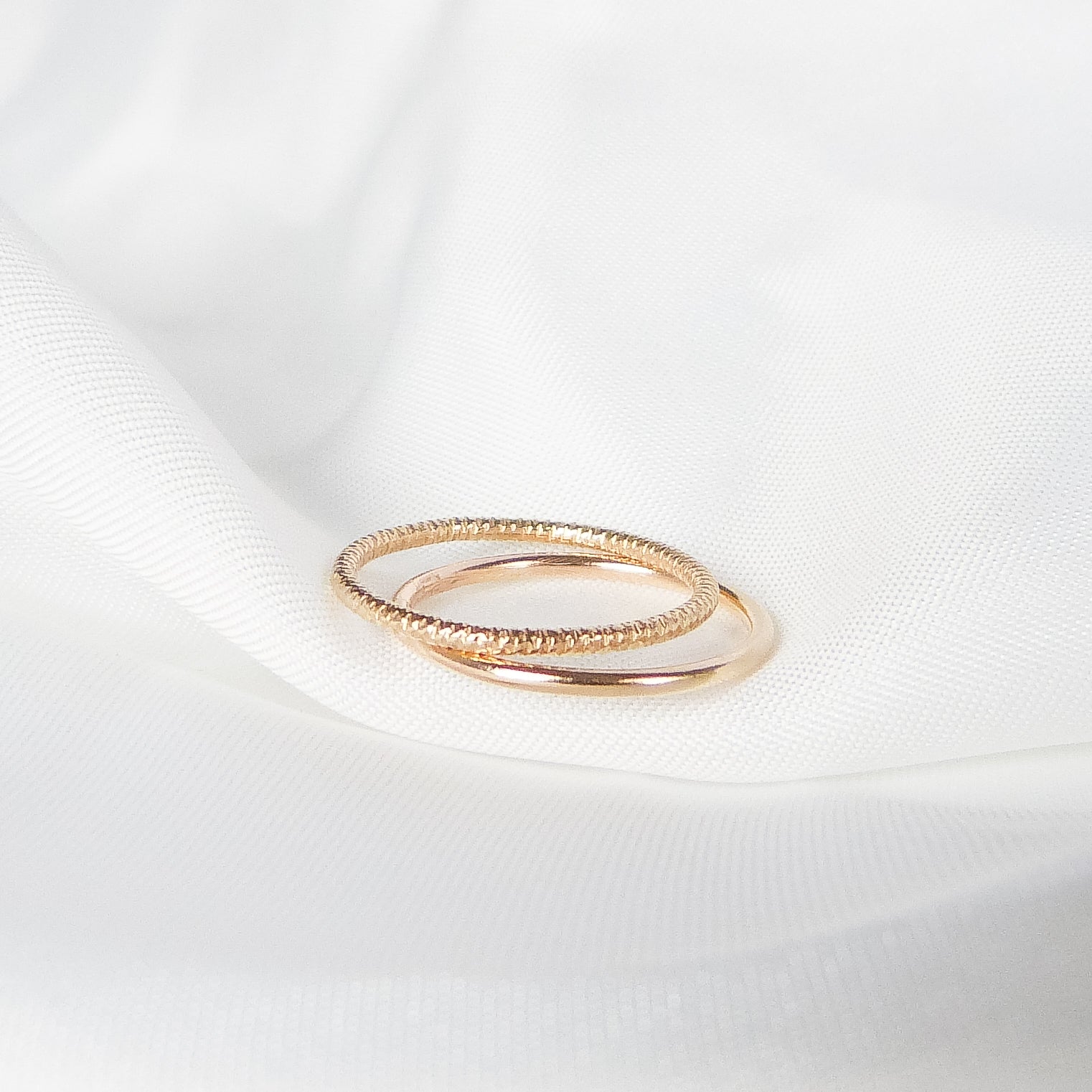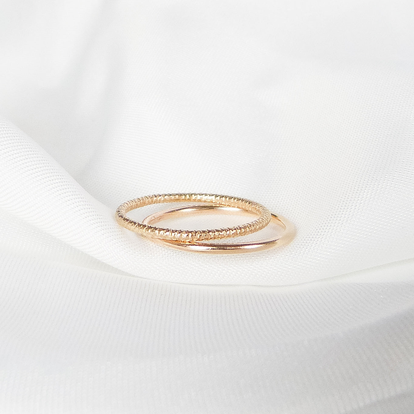 Delikatny duet pierścionków ze złota Gold Filled. Dopełniające się zestawienie gładkiej okrągłej obrączki z pierścionkiem AVENE. Tworzą ze sobą harmonijną całość – kwintesencja minimalizmu i ponadczasowej elegancji.