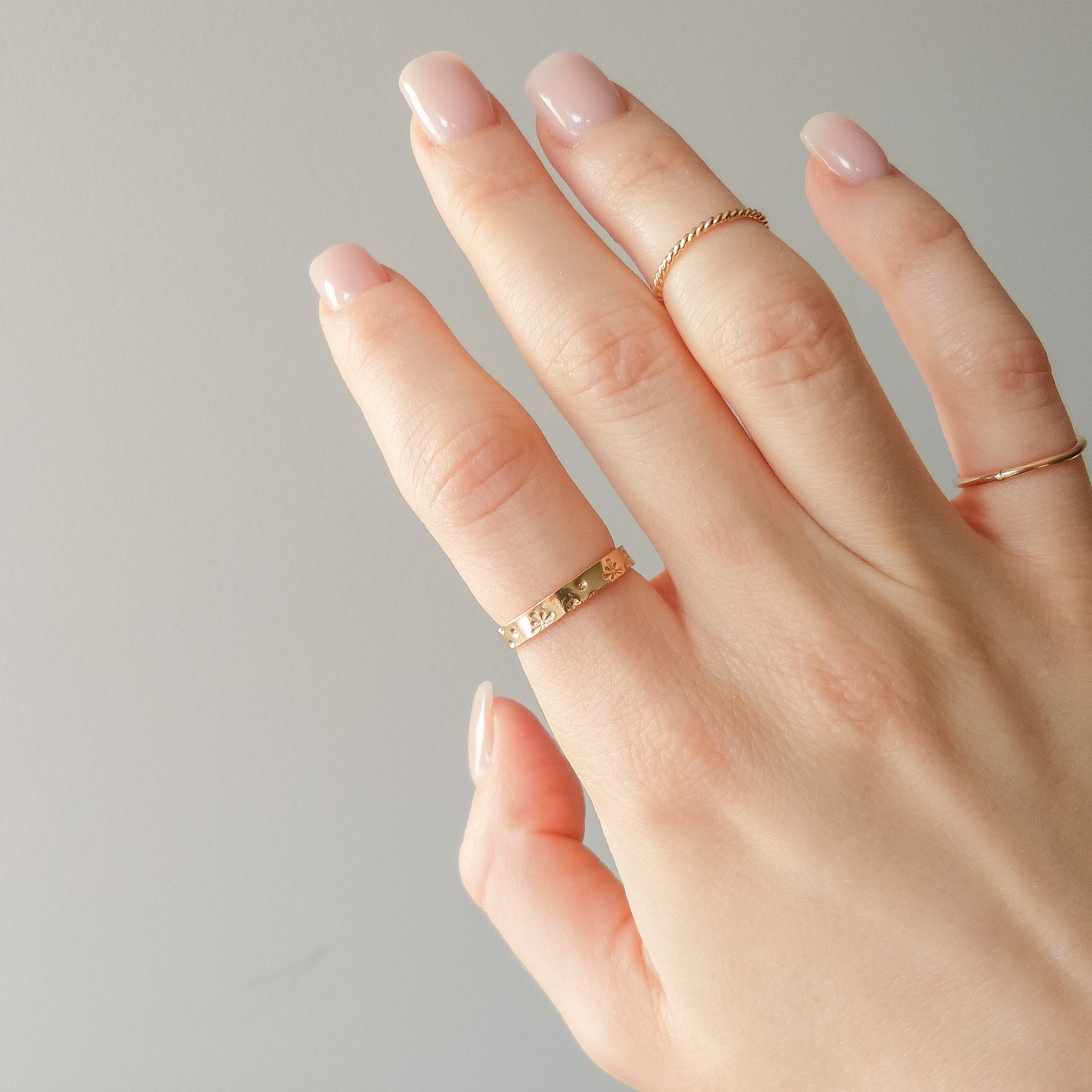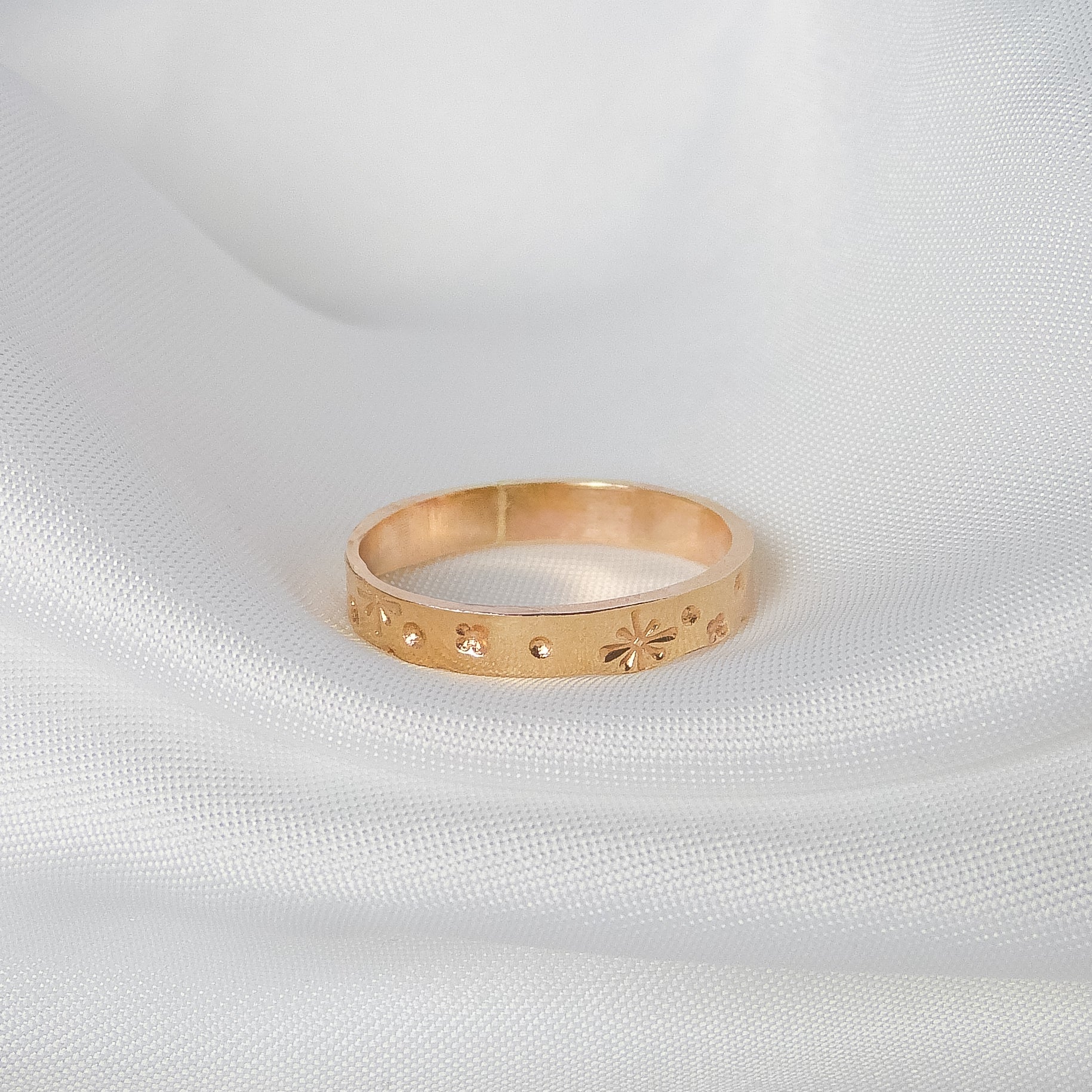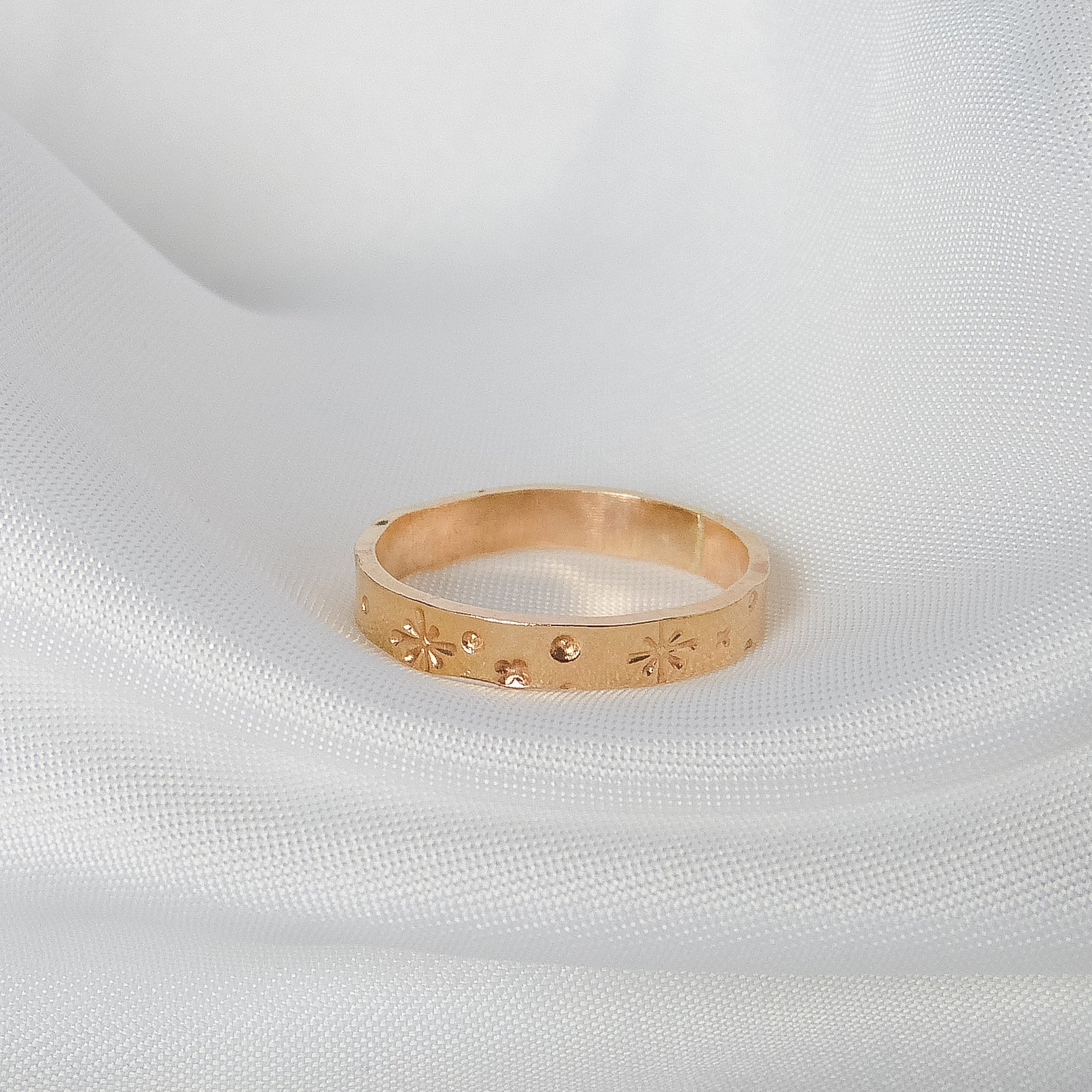 Nie ma dwóch identycznych pierścionków – drobne różnice w tłoczeniach sprawiają, że każdy z nich jest niepowtarzalny. Ze względu na kształt i szerokość obrączki zalecam wybór rozmiaru o jeden większego niż standardowy, aby zapewnić idealne dopasowanie i komfort noszenia.